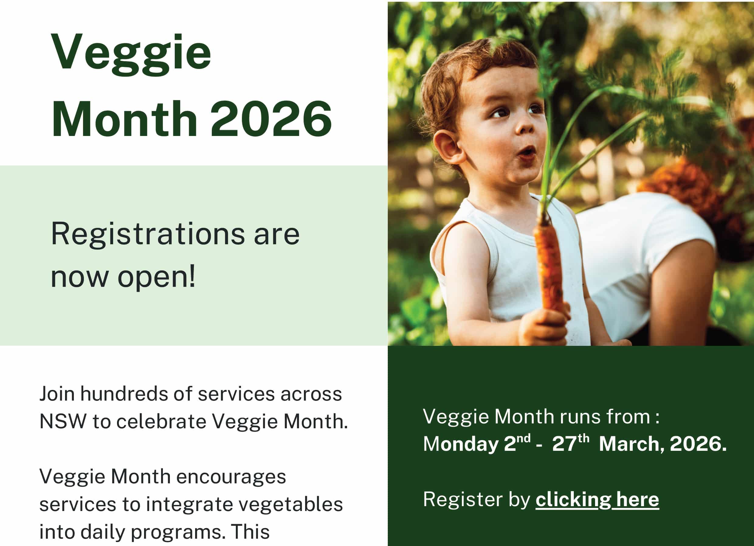 Join hundreds of services across NSW to celebrate Vegie Month, which takes place from Monday 10 March to Friday 4 April. The theme this year is ‘Be A Veg Explorer’. Click the link below to find out more and register.