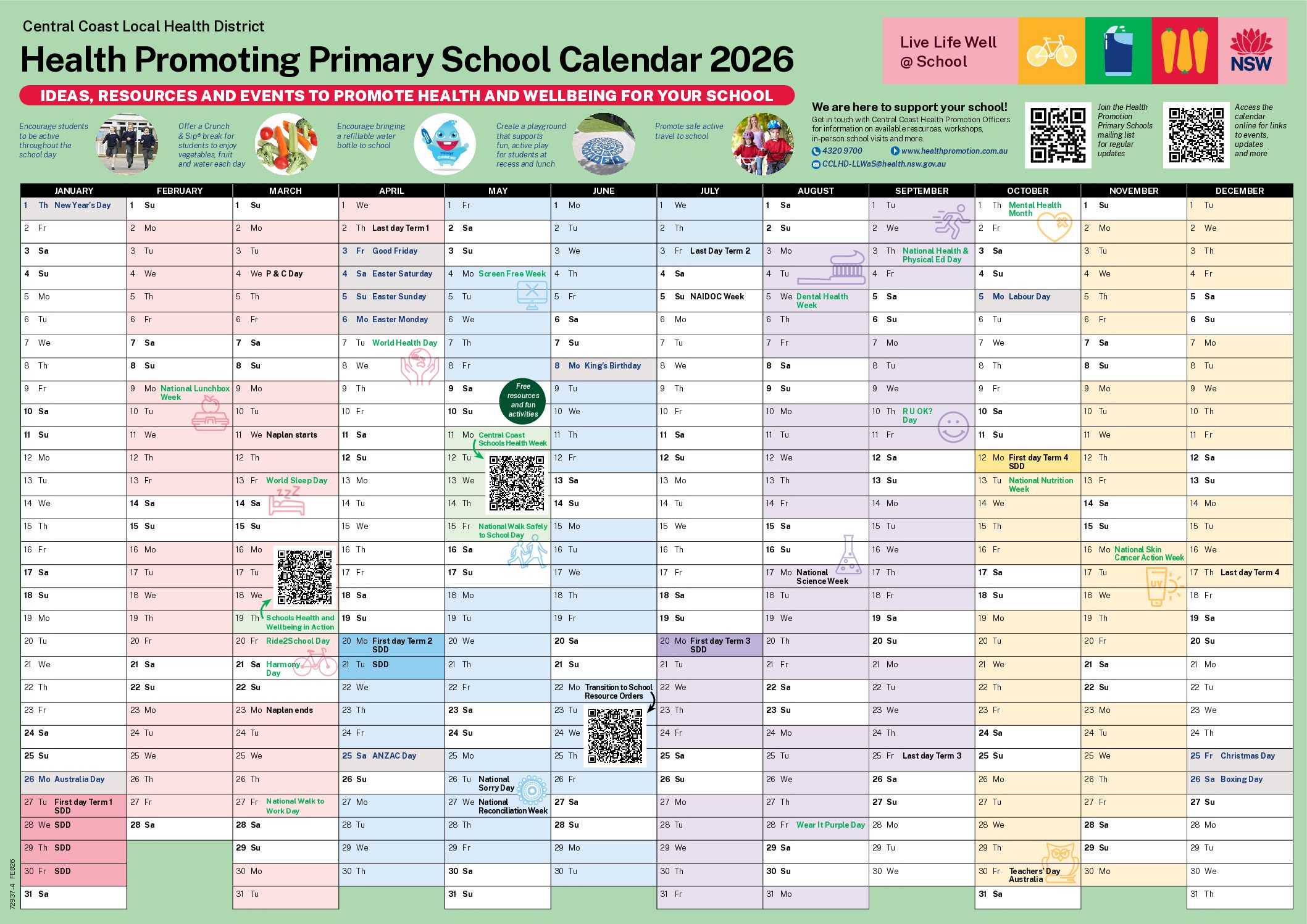 Our Health Promoting Primary School 2026 Calendar for teachers includes all you need to know about our support for schools in one place, including dates for things like: